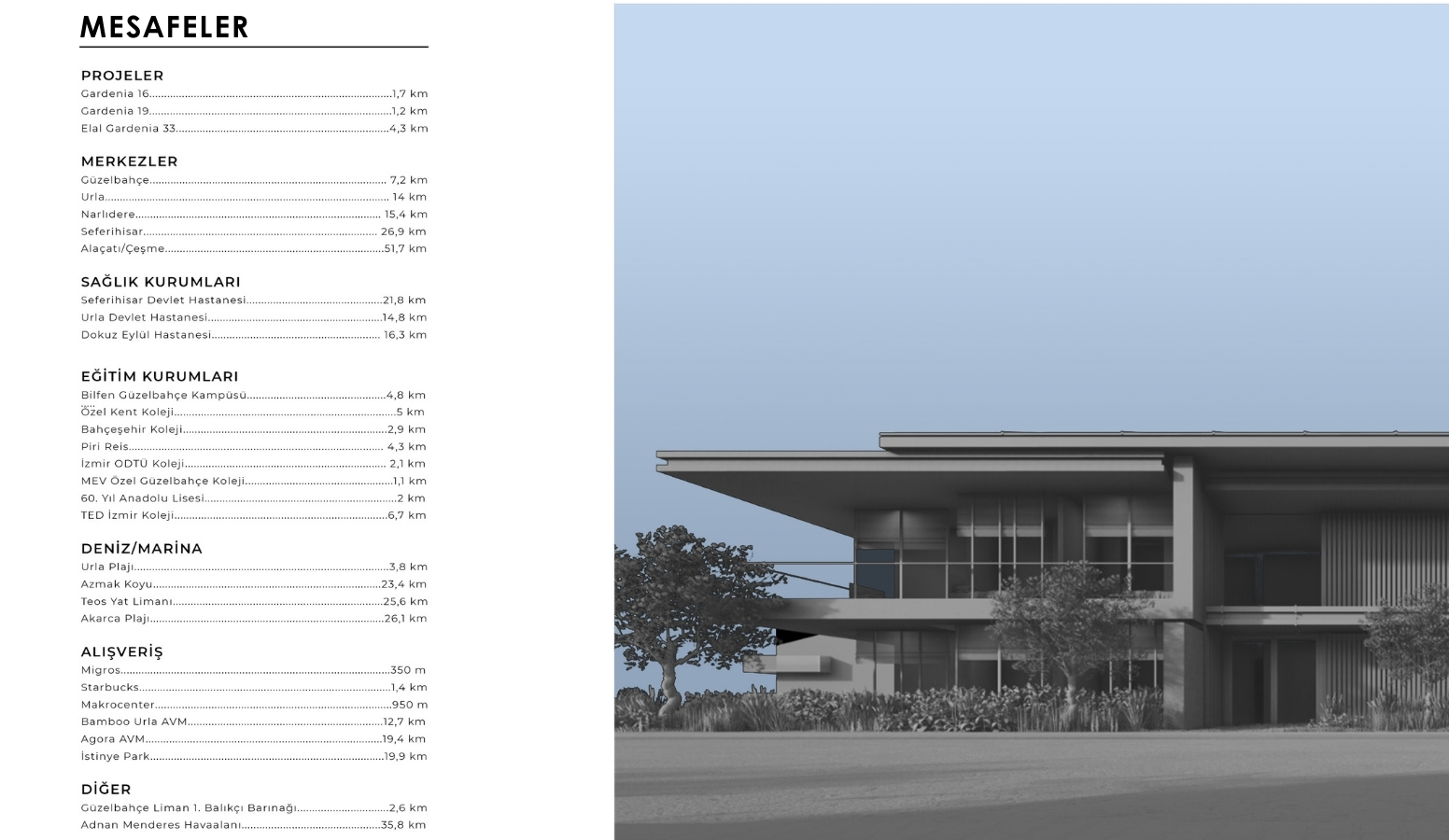Gardenia Flats konum olarak Macrocenter’a 2 dakika, Güzelbahçe Sahil Şeridine 5 dakika, Urla bölgesine 13 dakika, İzmir Şehir Merkezine 20 dakika, Adnan Menderes Havalimanı’na 25 dakika ve Çeşme’ye sadece 30 dakika uzaklıkta bulunuyor.